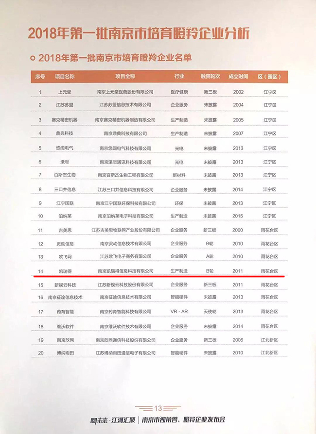 凯瑞得入选“2018年第一批南京市独角兽、瞪羚企业榜单”